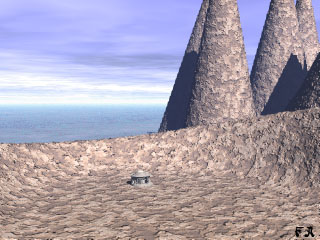 Down in the valley lies the temple. Be careful when climbing down. There are some skeletons of other adventurers buried under the stones.